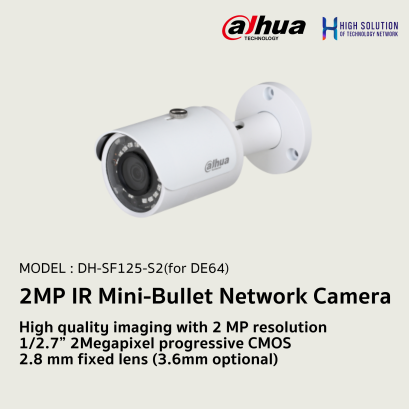 > 1/2.7” 2Megapixel progressive CMOS > H.265 & H.264 dual-stream encoding > 25/30fps@1080P(1920x1080) > DWDR, Day/Night(ICR), 3DNR, HLC, AGC, BLC > Multiple network monitoring: Web viewer, CMS(DSS/PSS) & DMSS > 2.8 mm fixed lens (3.6mm optional) > Max IR LEDs Length 30m > IP67, PoE